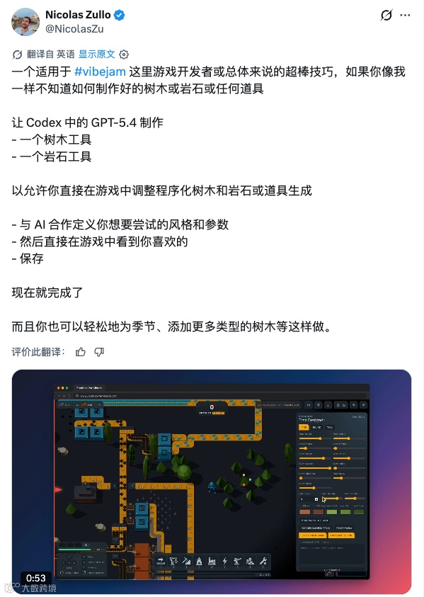 他让 Codex 做了一个建筑设计工具,可以在游戏运行时直接调整建筑参数。配合他最近发现的另一个能力,Codex App 可以直接在它自己的浏览器里运行网页游戏,他的工作流变成了这样。游戏直接在 Codex 里跑起来,因为 ZPM 是纯 Web 技术栈。他用自己让 Codex 做的工具调整建筑参数。让 Codex 改代码,游戏不用刷新就能看到变化。他可以直接点 UI 元素让 AI 知道他在说哪里。随时截图、随时迭代。