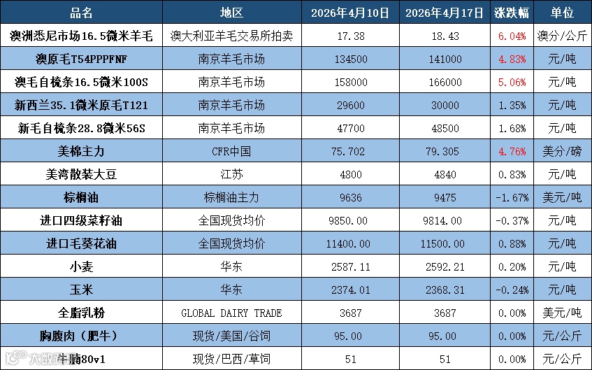 羊毛:澳大利亚羊毛市场在复活节休市后回归,连续连续两个拍卖周大幅上涨。休市期间累积的羊毛增加了本周供应量。本周期共有44775包羊毛上市,比上次多出8513包。开拍当天,较大的供应量吸引了广泛而强烈的竞争,推动价格一路走高。涨幅最大的是美利奴套毛,尤其是最佳型号、洗净率更高、草杂含量更低以及二检结果优异的羊毛。不过,较差型号也实现了上涨,因为买家激烈争夺市场份额。这些涨幅反映在细度指导价上涨了11至61澳分。东部市场指数(EMI)当日上涨了24澳分。由于澳元兑美元汇率走强,以美元计价,EMI指数涨幅更大。