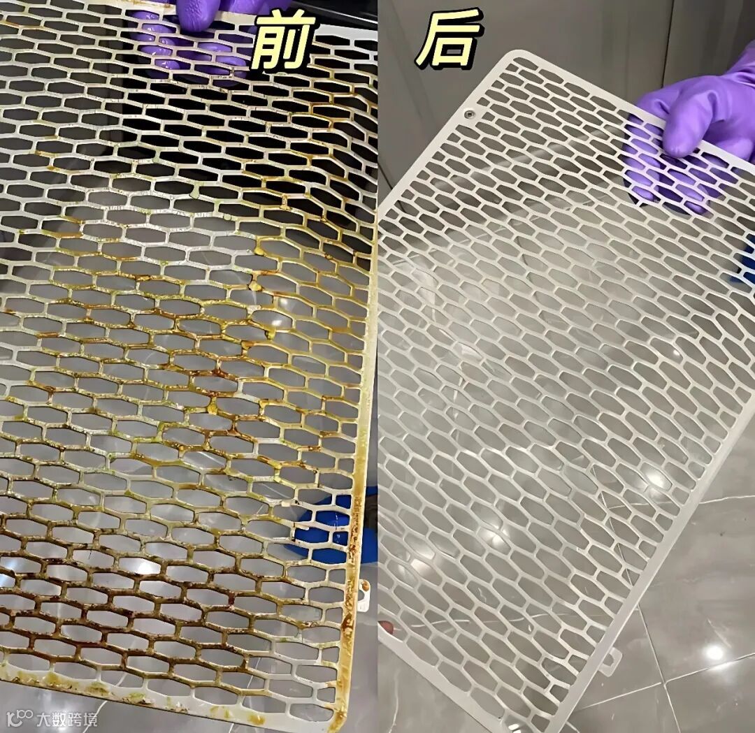 3、油烟机过滤网拆下来,倒上热水加小苏打泡一晚上,第二天拿刷子随便刷两下就干净了,别嫌麻烦攒到最后,油块硬了真的抠不动。常做饭的话两个星期清理一次就刚好。