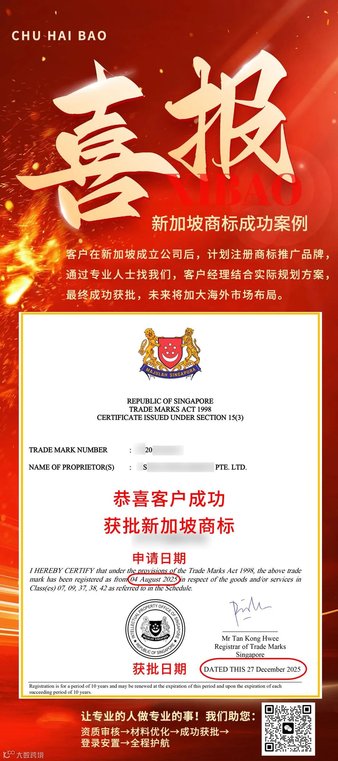 经过客户经理从前期规划到最终获证的全流程跟踪与精细化服务,S公司的新加坡商标于2025年12月27日正式获批,历时仅约5个月,远快于常规周期。