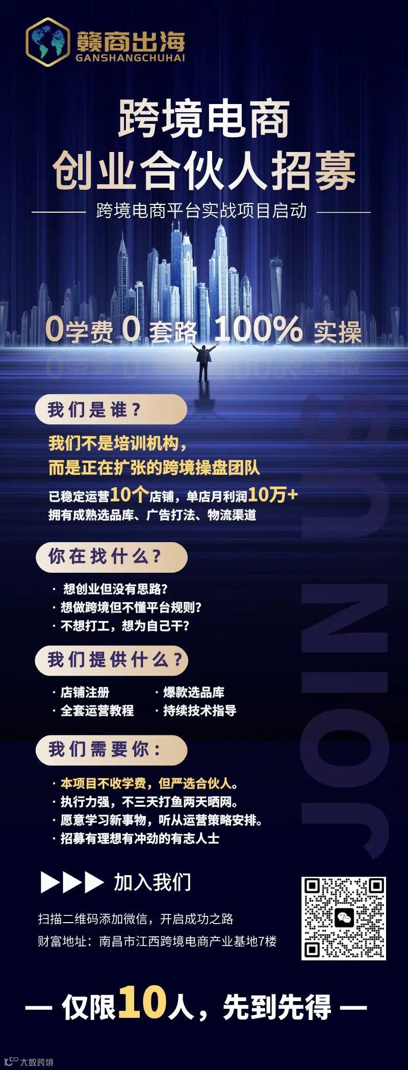 我们的线下办公点位于南昌市江西跨境电商产业基地 7 楼,欢迎本地伙伴线下面对面沟通,实地考察团队实力、项目细节。
