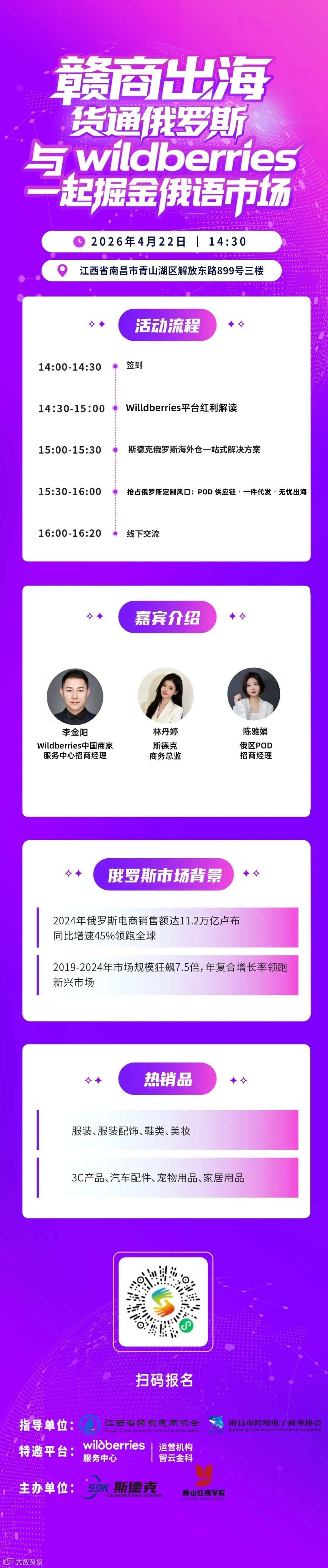 这些问题,4 月 22 日的「赣商出海・货通俄罗斯」线下沙龙,将为你解答。Wildberries 官方招商经理、俄罗斯海外仓专家、成熟 POD 供应链操盘手,齐聚南昌,带你拆解俄语市场的红利风口。