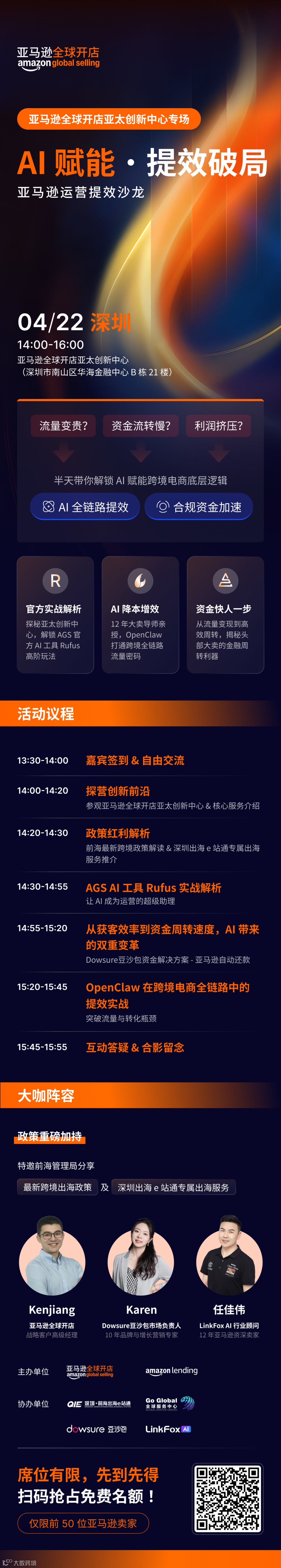 举办地点:深圳市亚马逊全球开店亚太创新中心(深圳市南山区华海金融中心B栋21楼)