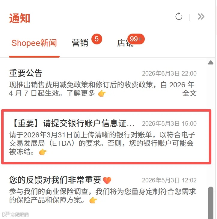 2026年4月9日,大批Shopee泰国站店铺突遭封停,提现功能被限制。此前平台已于3月5日发出通知,要求3月31日前完成银行存折照片核验,无任何宽限期。