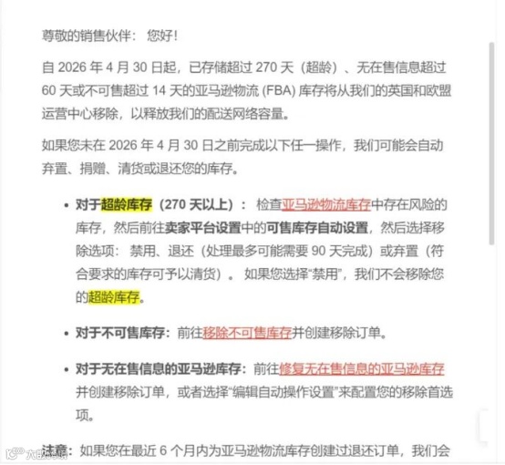 最近不少卖家,后台都收到了亚马逊的系统邮件,运营中心里存放#超过270天的库存,2026年4月30日前不处理,平台就替你处理。