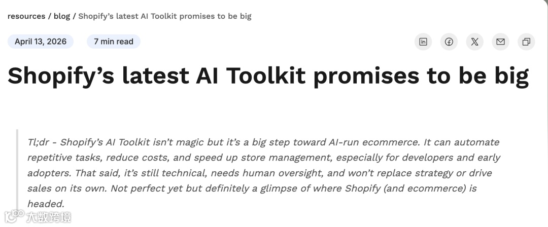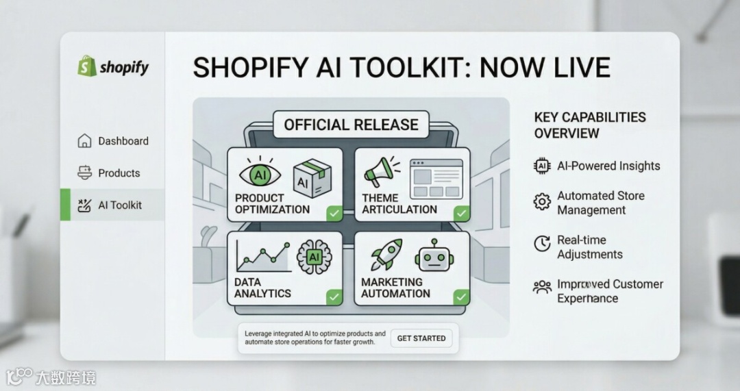 Shopify近期推出AI Toolkit工具,首次实现AI直接操作店铺后台,标志着电商运营从辅助决策迈向自主执行阶段。