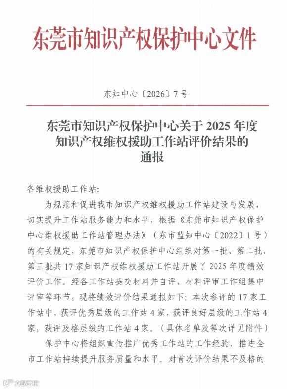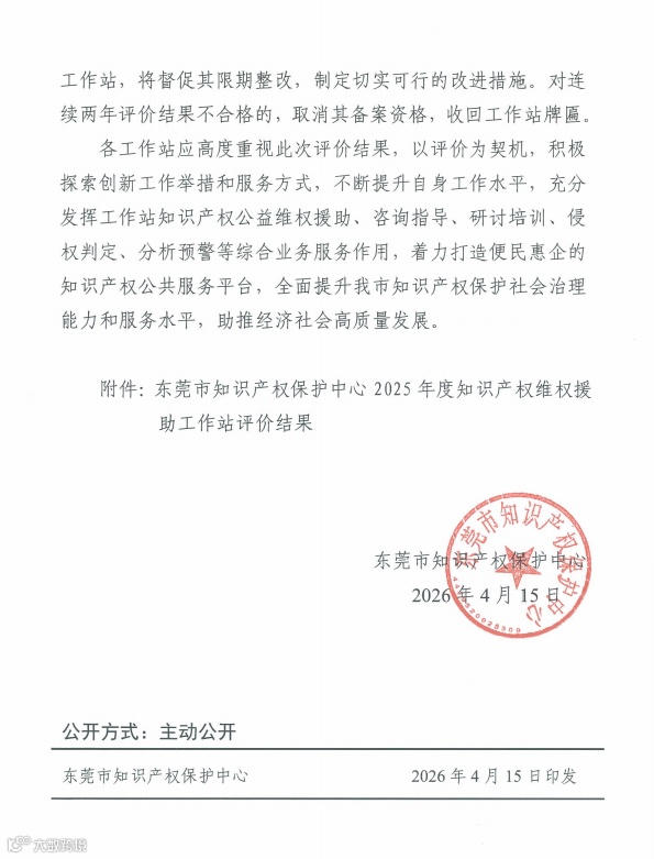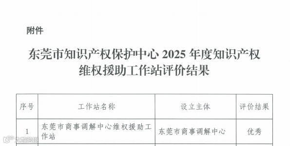 东莞市知识产权保护中心公布的2025年度评价结果显示,东莞市商事调解中心知识产权维权援助工作站获评优秀。该工作站全年走访企业53家,为中小微企业提供咨询、分析预警各20次,完成检索分析和侵权判定各3次;依托诉调对接机制高效调解知识产权纠纷7宗,平均结案周期30天,显著降低企业维权成本。