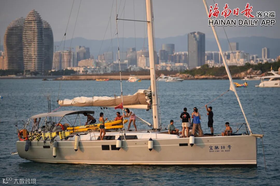 4月16日,第六届消博会三亚国际游艇分展区,嘉宾乘游艇出海。(记者 王程龙 摄)
