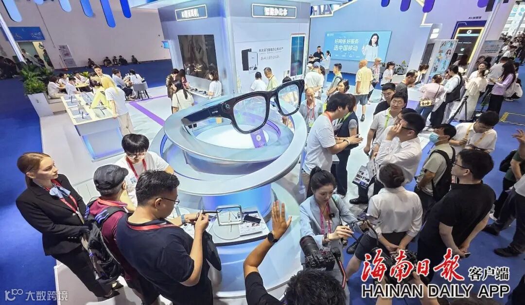 4月14日,第六届消博会1号馆科技消费展区内,多款AI眼镜吸引观众体验。(记者 陈元才 摄)