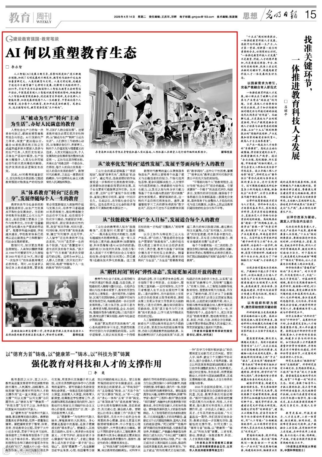 人工智能与教育深度融合是建设教育强国的战略机遇。从推动教育回归"人的全面发展",到构建泛在终身学习生态,从实现教育公平到培育"完整的人",AI为教育现代化提供全新路径。必须将这一融合纳入教育强国建设整体规划,锚定"伴随每个人一生、平等面向每个人、适合每个人、更加开放灵活"的教育愿景,推动教育全方位革新,更好承载厚植人民幸福之本、夯实国家富强之基的时代使命。