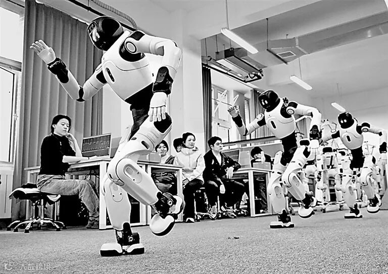 在青岛职业技术学院具身智能机器人实训基地,人形机器人在课堂上进行动作编程效果演示。新华社发