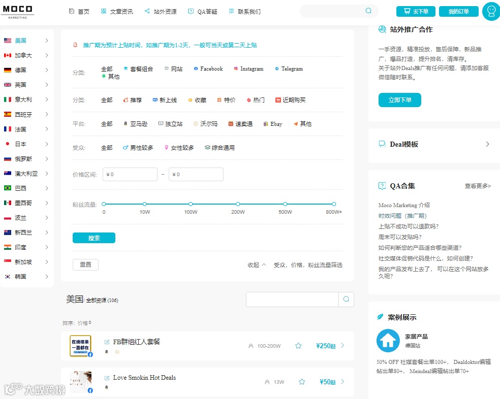 Moco Marketing成立于2021年,专注跨境站外推广,已覆盖美国、加拿大、德国等欧美亚多国站点,提供质保套餐、FB/Ins红人、Deal网站及Telegram等全平台资源。