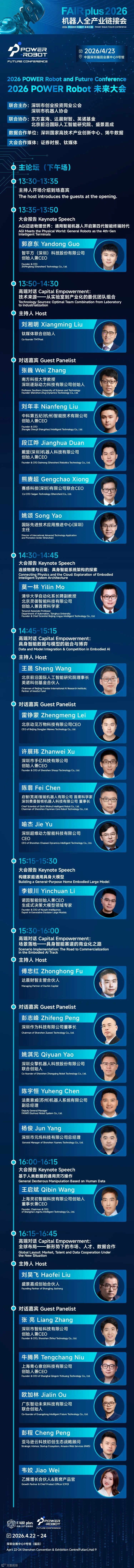 4月22-24日,"FAIR plus2026机器人全产业链接会"将在深圳会展中心(福田)9号馆举行,规模达15000平方米,汇聚500余家展商,聚焦机器人全产业链技术与资源。展会首日同步举办"2026 POWER Robot未来大会",主论坛定于4月22日全天在9号馆1号会议室展开,聚焦具身智能、核心部件及产融结合等核心赛道,深入探讨技术突破路径、商业化落地策略、国际标准共建及全球资源精准对接,为产业未来增长提供全方位解码。