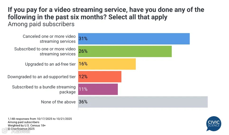 通胀压力和"订阅疲劳"正推动用户主动选择广告模式。Bango最新调研显示,36%的美国人愿接受两倍广告量以降低订阅费用,年轻群体接受度更高。