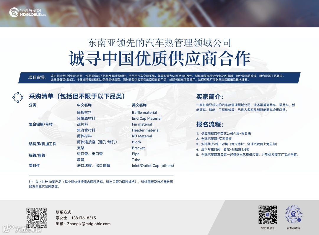 东南亚一家领先的汽车热管理企业,正式委托全球汽贸网开展中国市场供应商甄选。此次大规模持续性采购,尤其适合具备铝材加工、冲压或精密制造能力,且已在或计划在东南亚布局生产能力的中国企业。