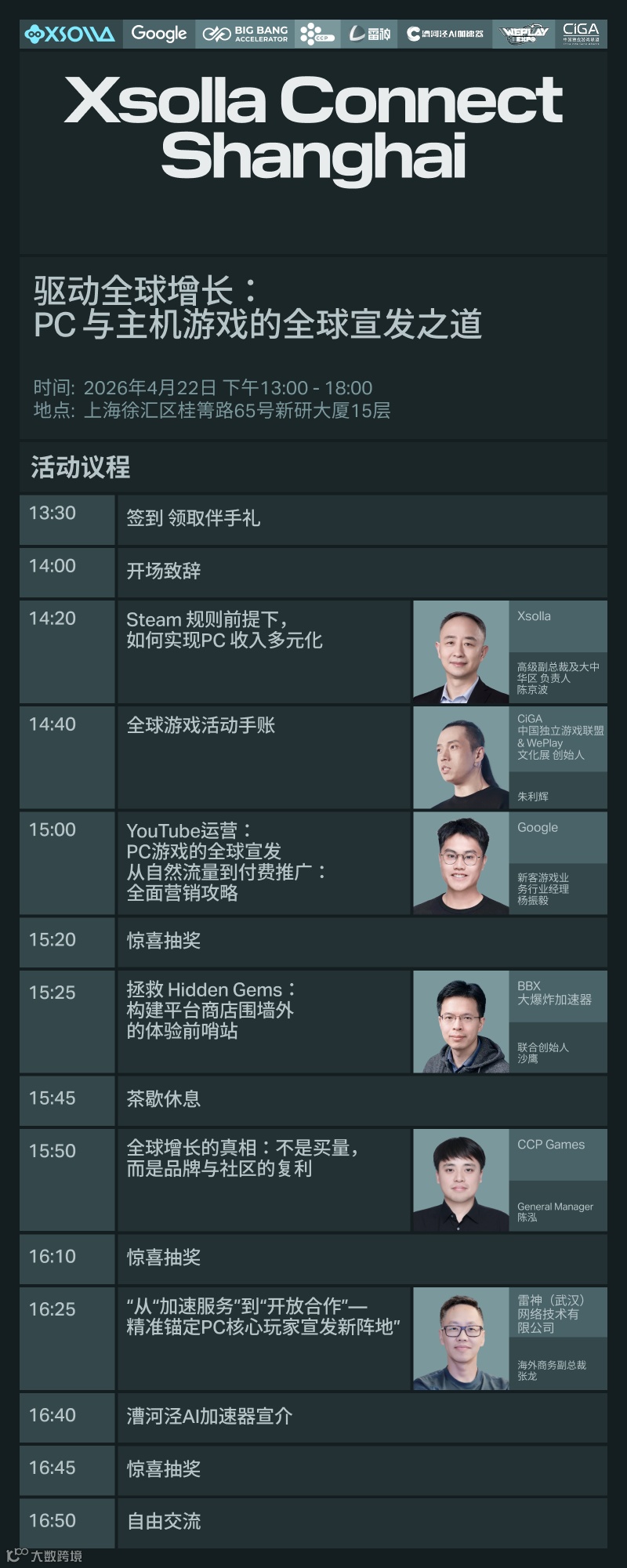 Xsolla联合Google举办"驱动全球增长:PC与主机游戏的全球宣发之道"行业峰会,将于2026年4月22日在上海举办,提供从战略布局到实操落地的全链路出海指南。