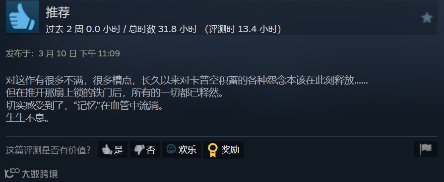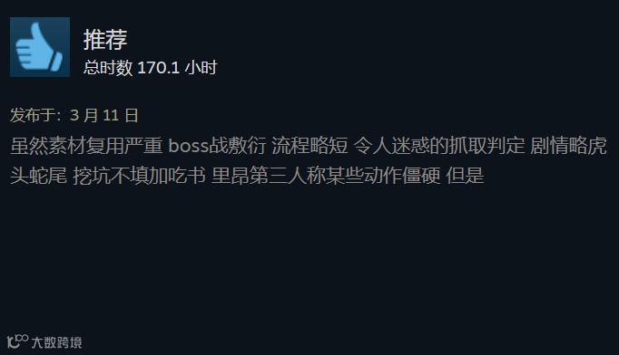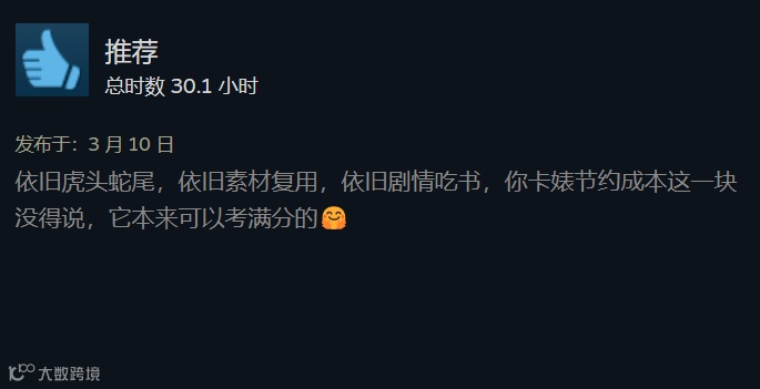 玩家社区反馈显示,部分用户指出十小时流程难匹配300元定价,批评集中在“素材复用”“双线割裂”等问题。但多数评测认为,瑕不掩瑜的实际体验仍推动其口碑持续向好。