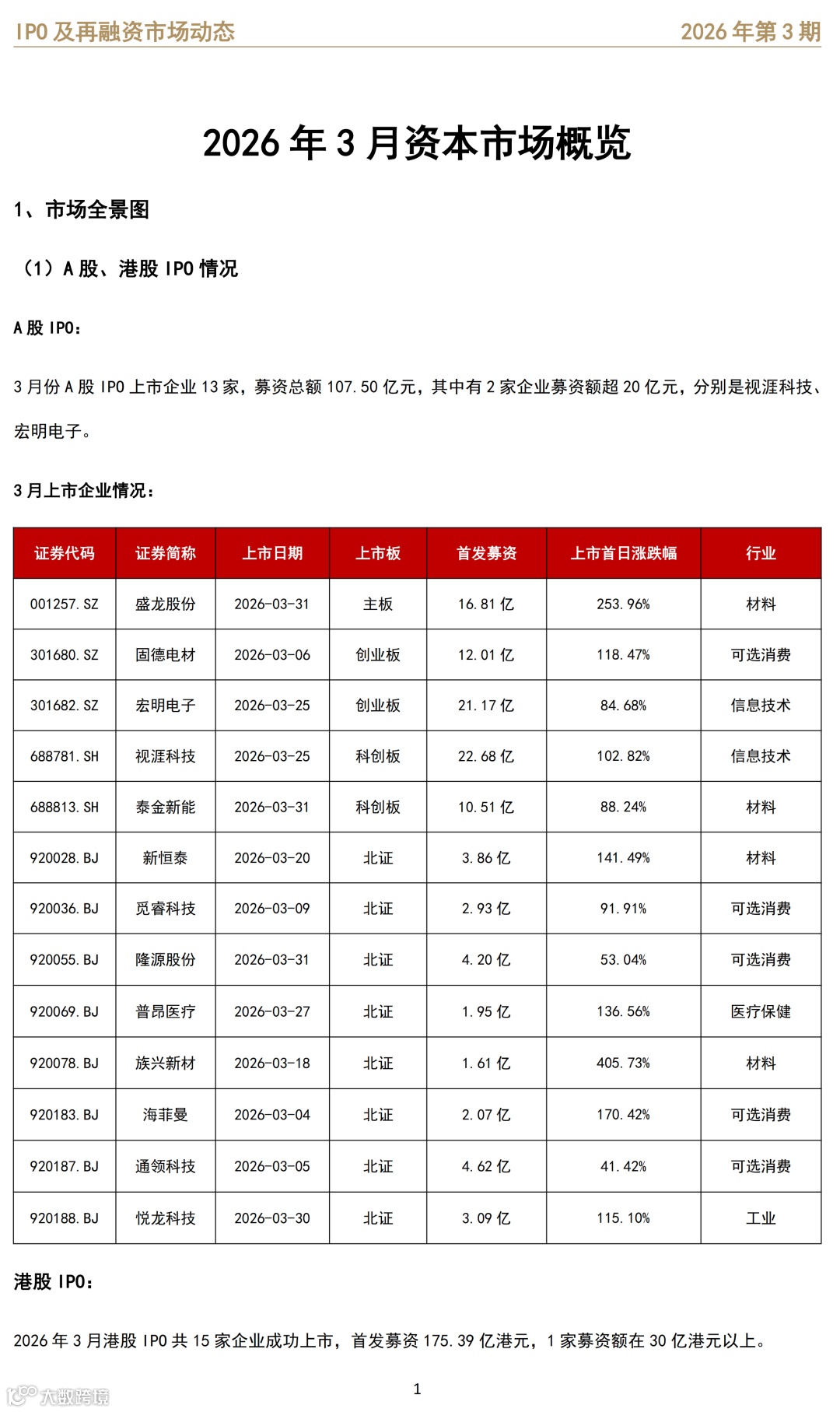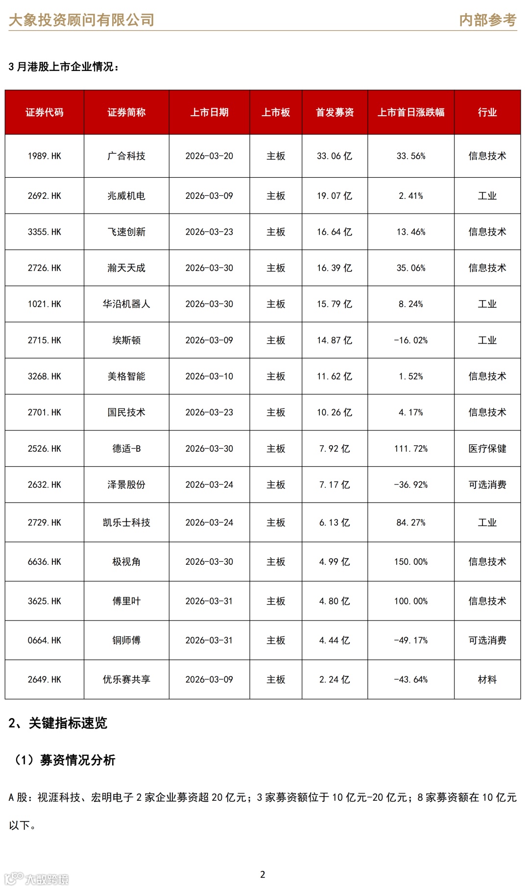 3月30日,港交所迎来华沿机器人、德适生物、瀚天天成和极视角四家硬科技企业同日挂牌,业务覆盖协作机器人、AI医疗、第三代半导体及计算机视觉领域。此次集中上市凸显港股对硬科技的高度认可,标志着AI、半导体等产业链加速资本化进程,成为2026年港股IPO市场科技化转型的关键节点。