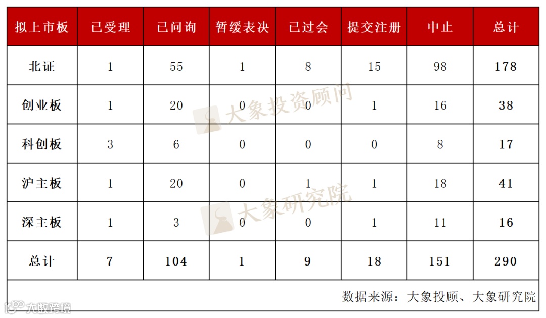 数据显示,截至4月19日,沪深北交易所IPO排队企业共计290家,上周新增两家获受理企业。