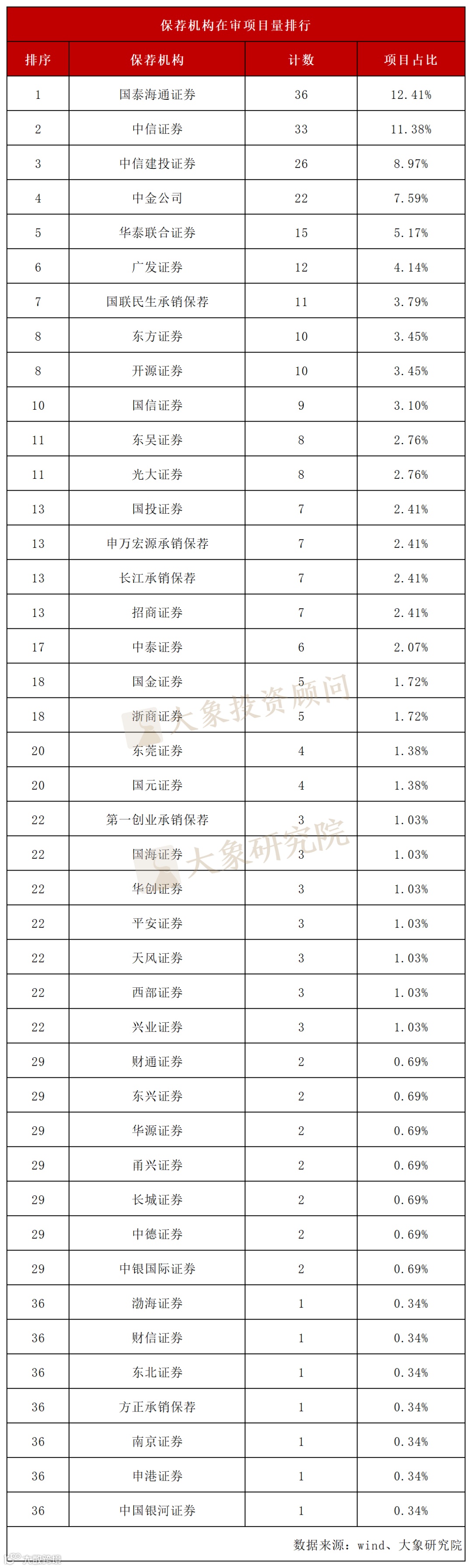42家券商投行担任290家排队企业的保荐机构,项目量前三如下: