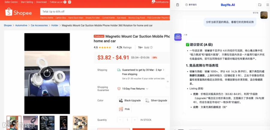 "八爷"是轻量级浏览器插件,具备自动分析网页与生成报告能力,可直连1688推荐采购方案。其核心优势包括:记忆系统留存老板偏好;覆盖Tiktok、Shopee、亚马逊等多平台;提供抠图、标题优化、价格算法等场景化解决方案。
