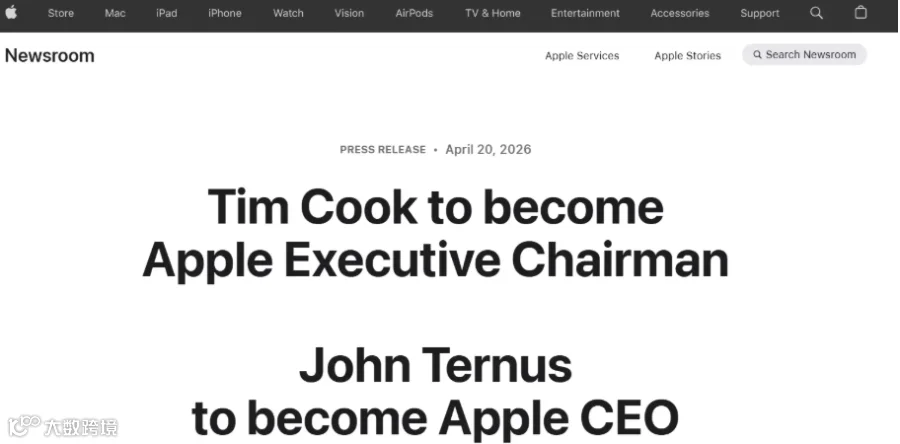 2026年4月20日,苹果正式宣布硬件工程高级副总裁约翰·特努斯将于9月1日接替库克,成为公司第八任CEO。库克将转任执行董事长,继续参与公司事务。此次交接结束多年外界猜测,标志苹果领导层平稳过渡。