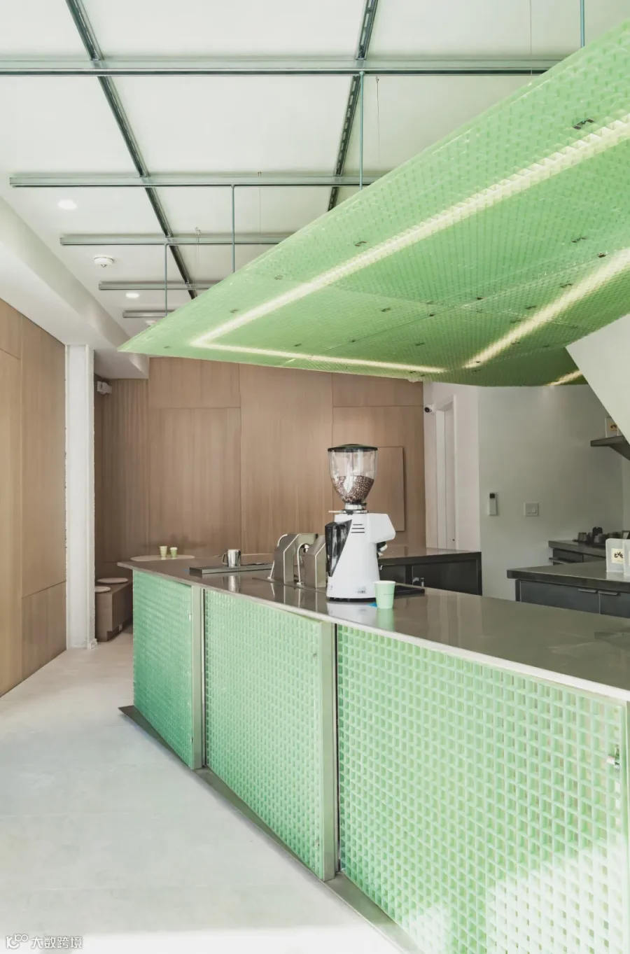 通过将半透明且色彩独特的工业材料引入室内,设计师巧妙地借用了自然光与人造光,让坚硬的绿色 格栅材料呈现出随时间流动的朦胧质感。而裸露的金属网格系统,则不仅解决了结构悬挂问题,更以其理性的线条与格栅的柔和色彩形成张力,构建了空间的视觉层次。