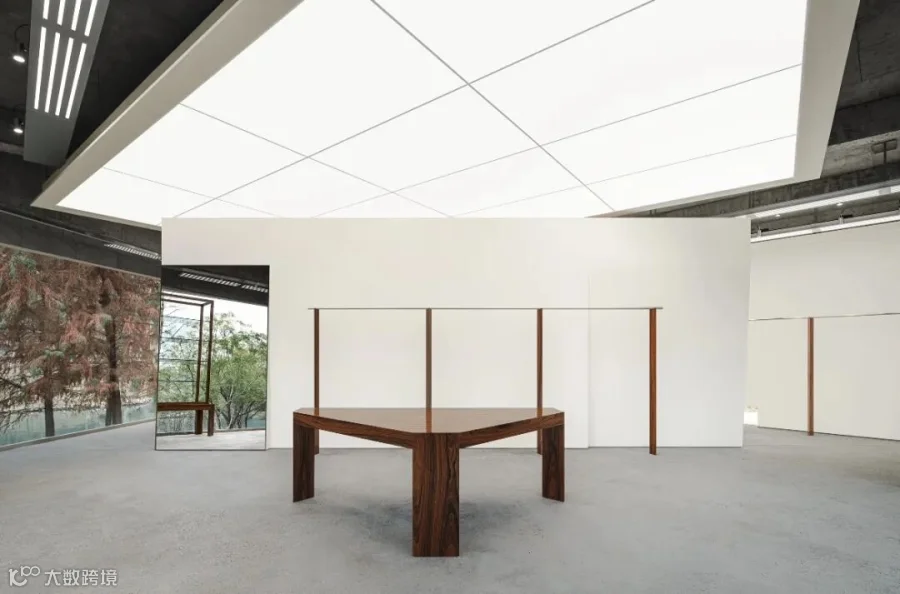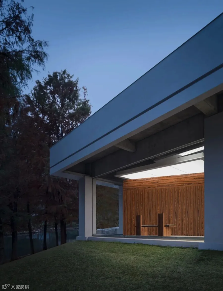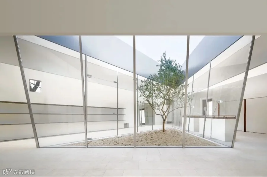 一个三角形的中庭和临湖的水杉林共同构成内向和外向的风景,成为设计的起点。利用原始建筑中庭结构,勾勒出一个完美的三角形庭院,试图拥抱一片风景,将其包裹起来,环绕中庭设置的三片白墙并不与中庭的三边完全平行,而是形成一个微妙的角度,变窄或变宽,墙体之间微微露出尽端的水杉,引导人们向深处探索。