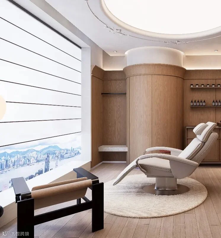 空间布局遵循环形动线,诊疗室、咨询区与休憩区动静分离,选用微水泥、大理石纹砖等质感材质,搭配无主灯设计与定制香氛,既满足医疗操作的严谨需求,又以柔化细节消解传统医美的距离感,让每一次体验都沉浸在简约大气的氛围之中。
