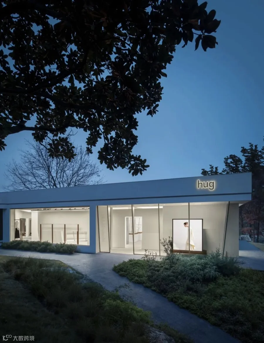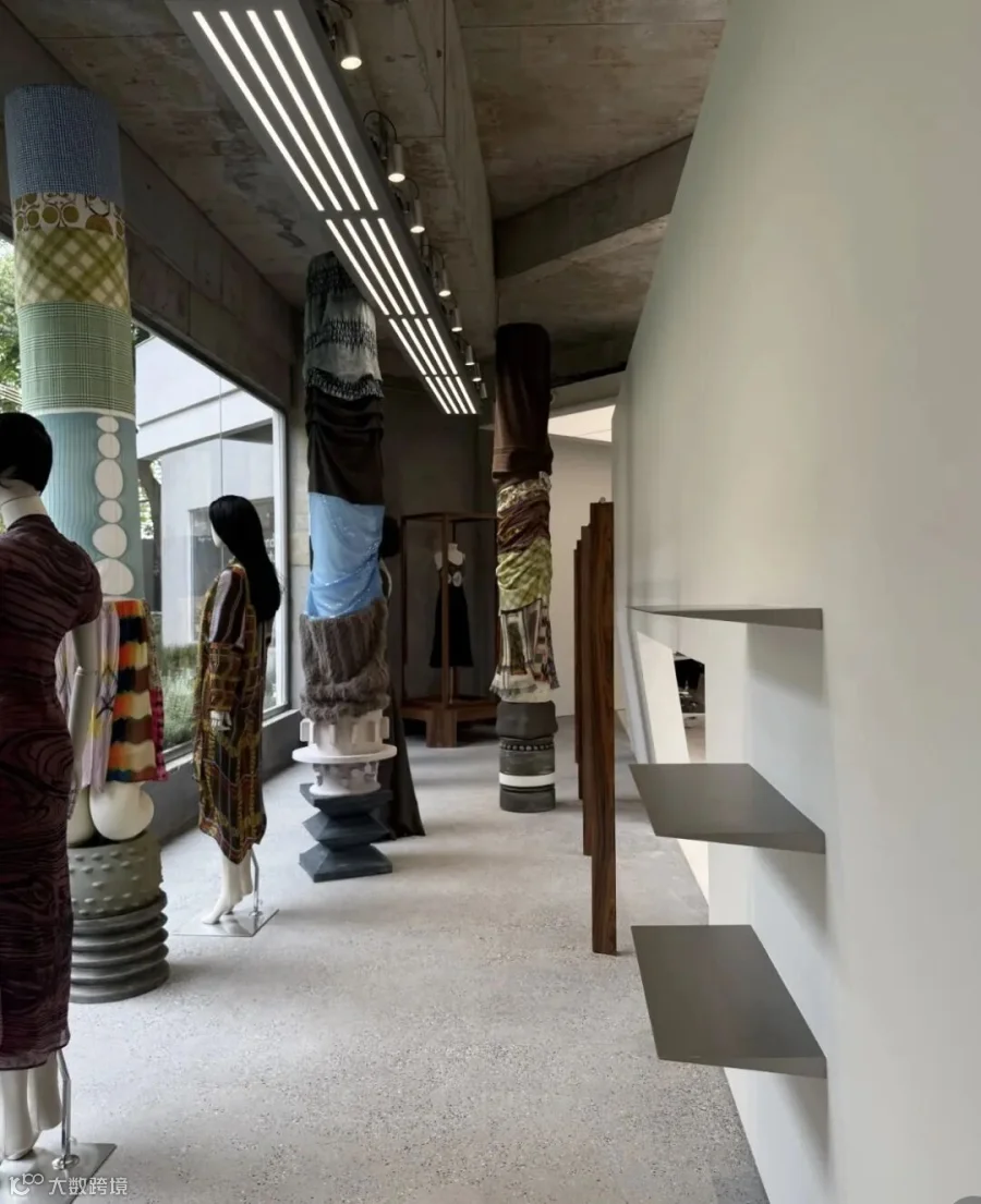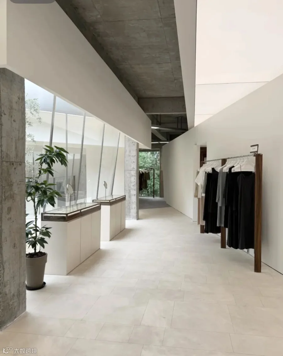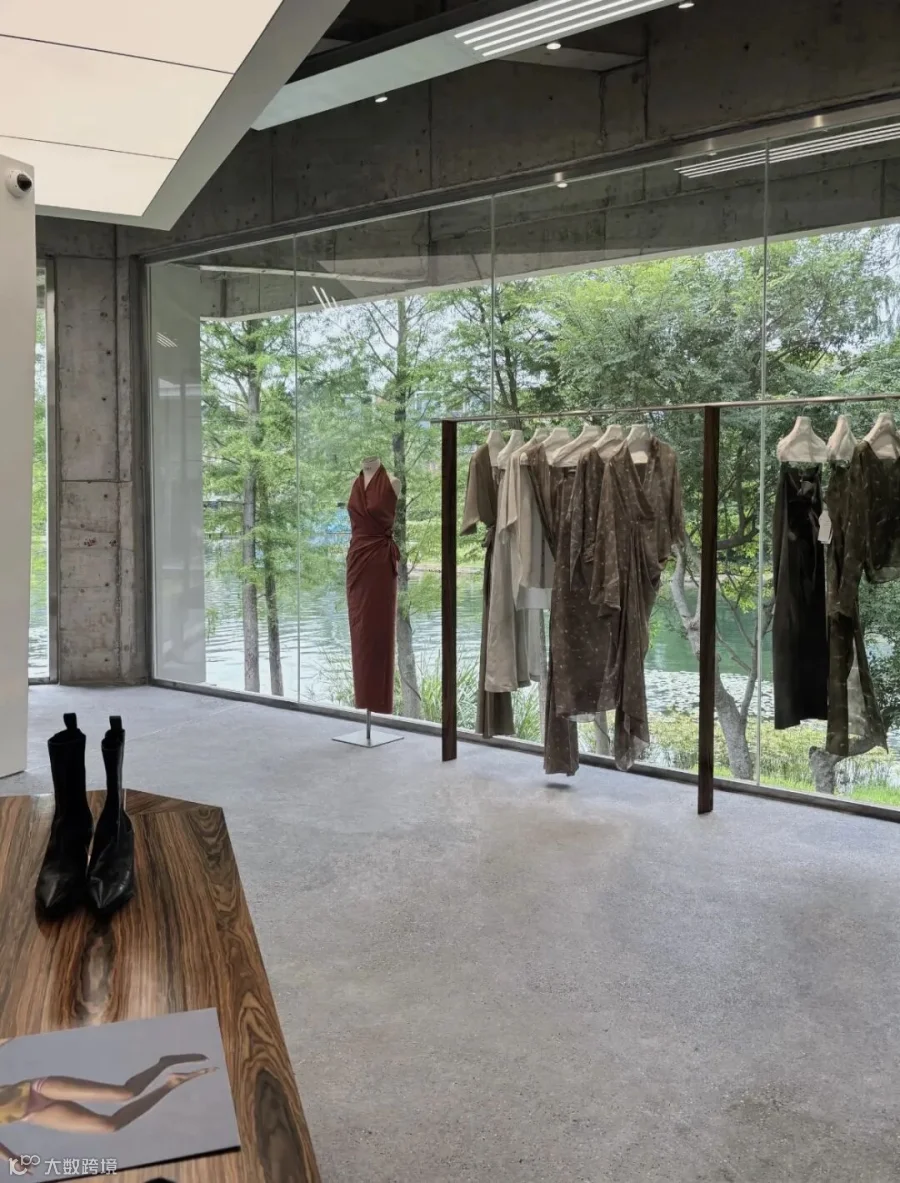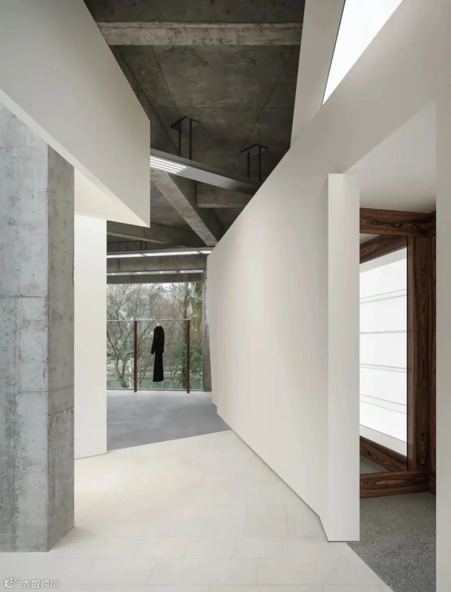 穿过墙体的间隙,连续的大面积玻璃幕墙将水杉林和湖景尽收眼底,形成截然不同的开放氛围。另一片斜向放置的白墙将外向的空间划分为更具亲和力的尺度。白墙经过适当的裁切和弯折,融入试衣镜和陈列功能,在细节处传递轻巧的造型趣味。