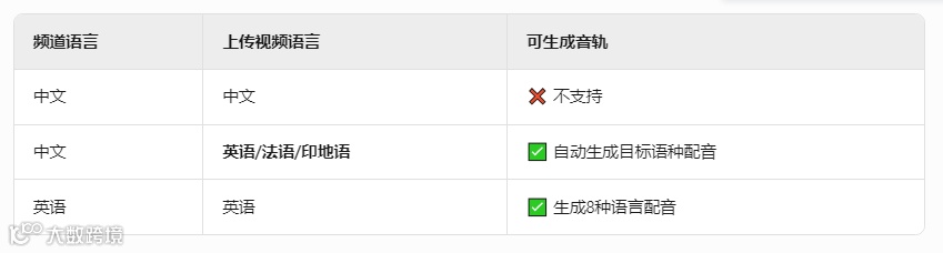 - 源语言→英语:上传法语/德语/印地语视频时,自动生成英语配音
