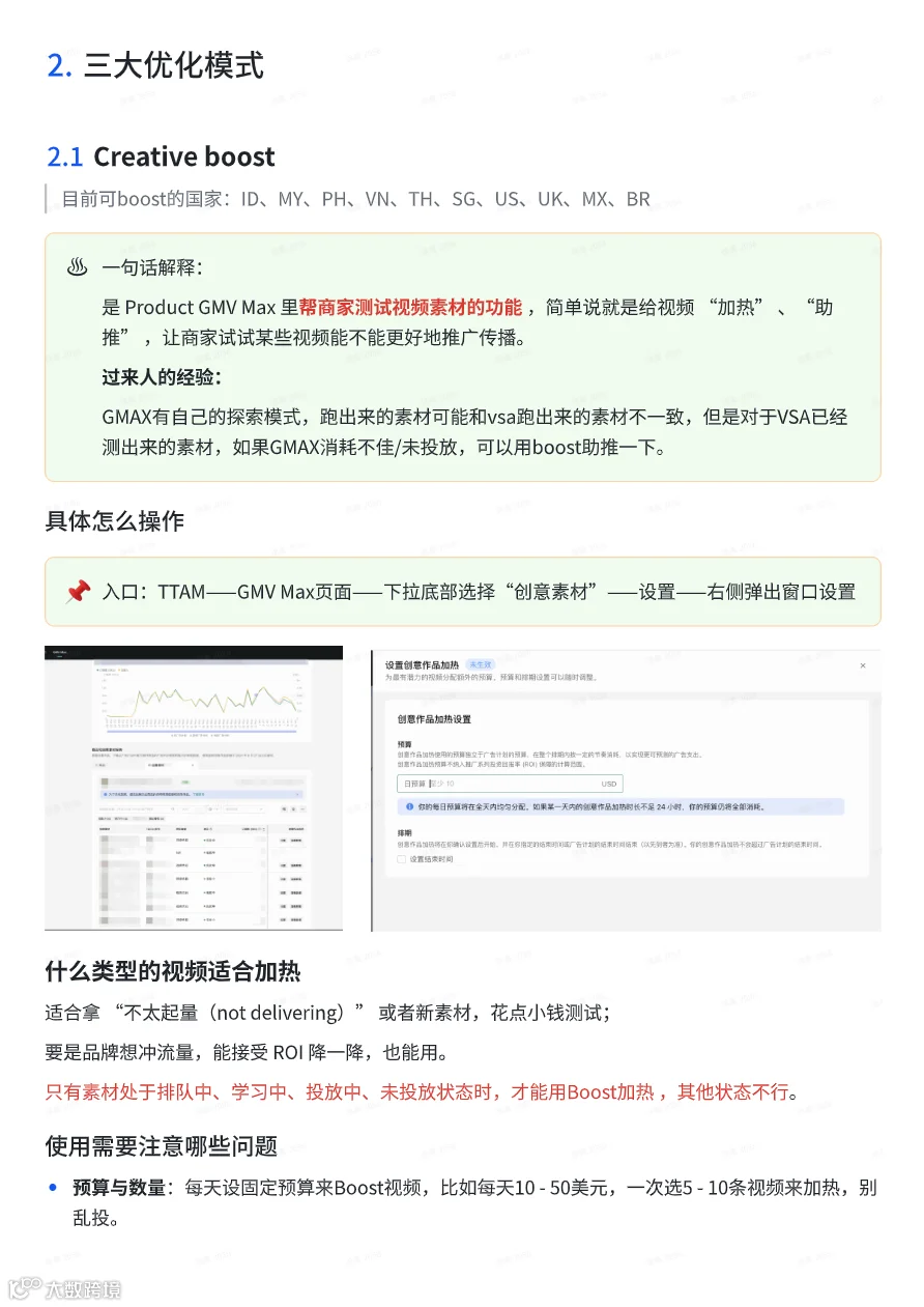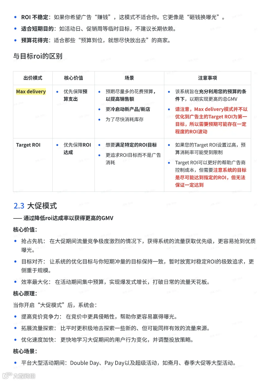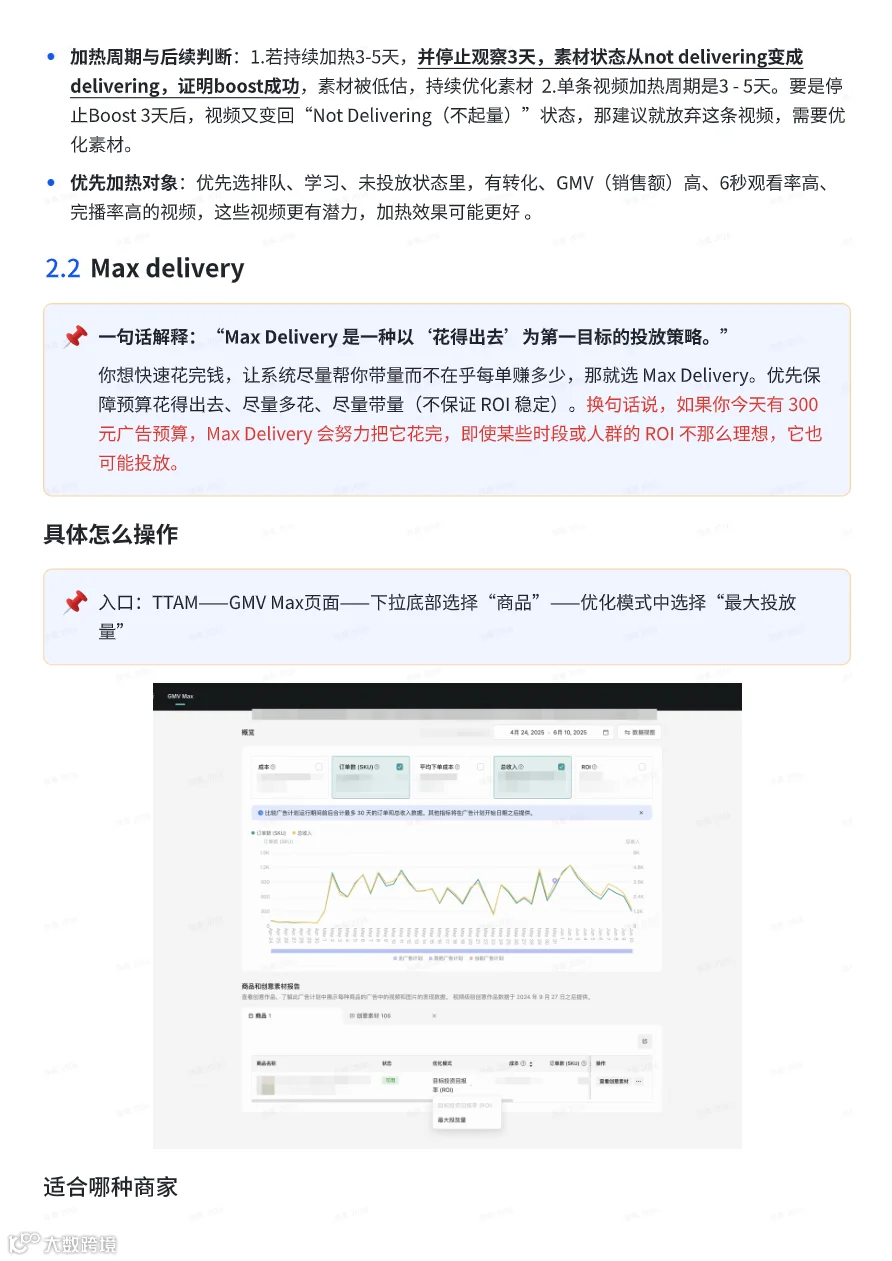 Creative Boost用于小成本加热潜力素材(建议每日10–50美元,持续3–5天);Max Delivery以预算消耗为核心,适合冷启动或大促冲量;大促模式通过降低10%–20% ROI目标换取最高30% GMV增长,自动提升50%预算额度。
