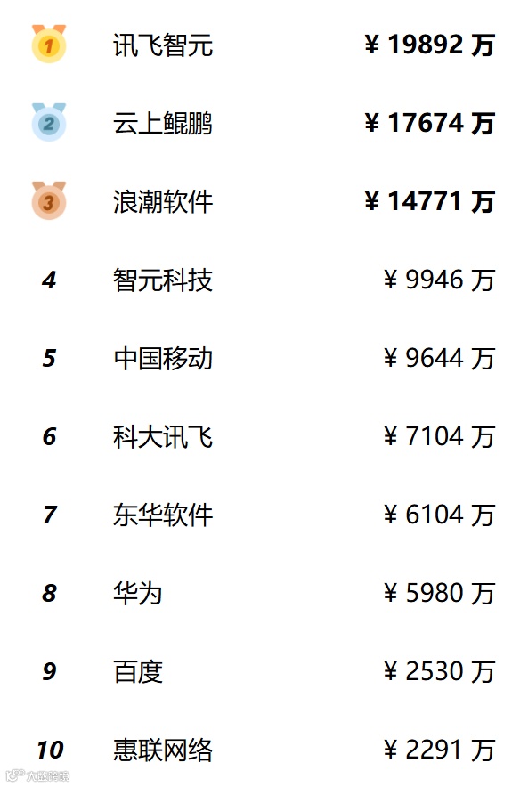 讯飞智元位居榜首,累计金额接近2亿元人民币。这充分展示了其在该领域的技术实力和竞争力。科大讯飞作为国内领先的人工智能企业,拥有深厚的技术积累和丰富的行业经验,能够为客户提供高质量、定制化的解决方案。其强大的技术实力和专业的服务团队,使得其在多个行业领域都取得了显著的成果。