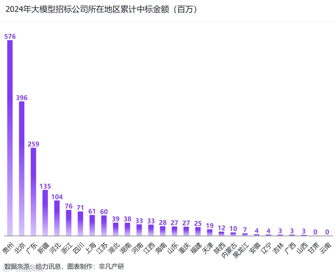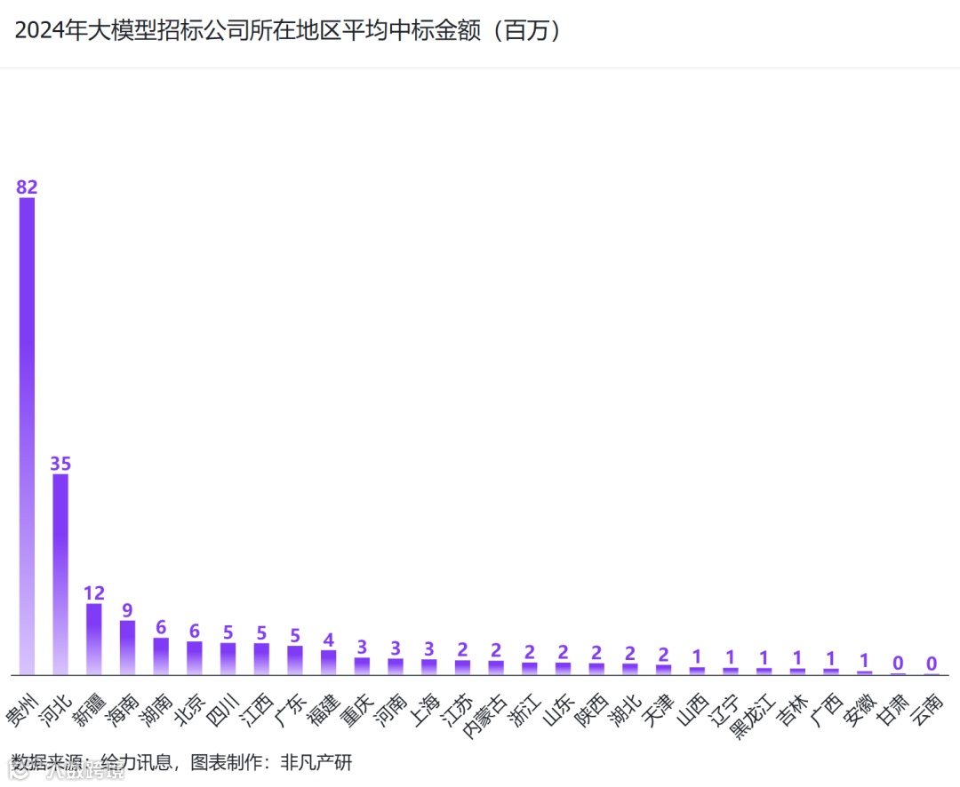 贵州因为几笔巨额订单的存在,以8227万元的平均中标金额位居第一。贵州作为西部地区的重要省份,积极响应国家关于数字经济发展的号召,通过政策引导和市场需求的双重驱动,推动了大数据和人工智能等相关产业的快速发展。这也使得贵州地区在大模型建设方面的需求不断增加,进而促进了中标金额的提升。从榜单上来看,多数地区的平均中标金额在500万以内,云南、甘肃等地的平均中标金额相对较低,分别为15万元和23万元。