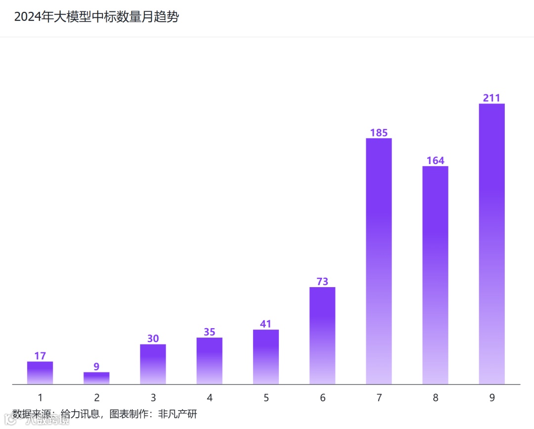 从趋势角度分析,1-9月大模型中标金额呈现出一种不稳定的态势,各月之间的金额波动较大。其中,3月份的高额中标可能归因于某些特定的大型项目落地或是相关行业的旺季效应。相反,1月份的低额中标则可能与年初的业务规划调整、市场预热不足等因素有关。