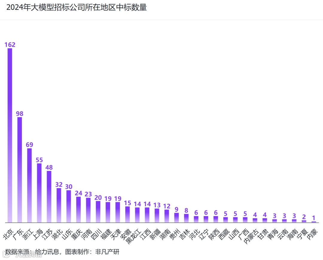 地域分布上,北京以 162 次的中标数量显著领先,北京的科技创新中心地位愈发显著。广东省凭借强大的经济技术实力,以98次排名第二;浙江中标次数69次位居第三。北京、广东、浙江、上海等地表现突出,而部分西部地区如内蒙、云南相对落后。这种分布可能与地区的经济发展水平、科技产业基础以及政策支持力度等因素相关。经济发达地区通常拥有更完善的基础设施和更多的科技企业,从而在大模型招标中更具优势。