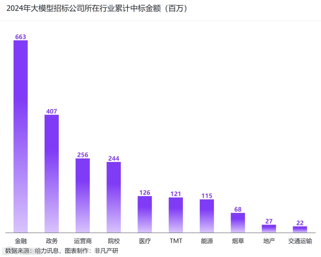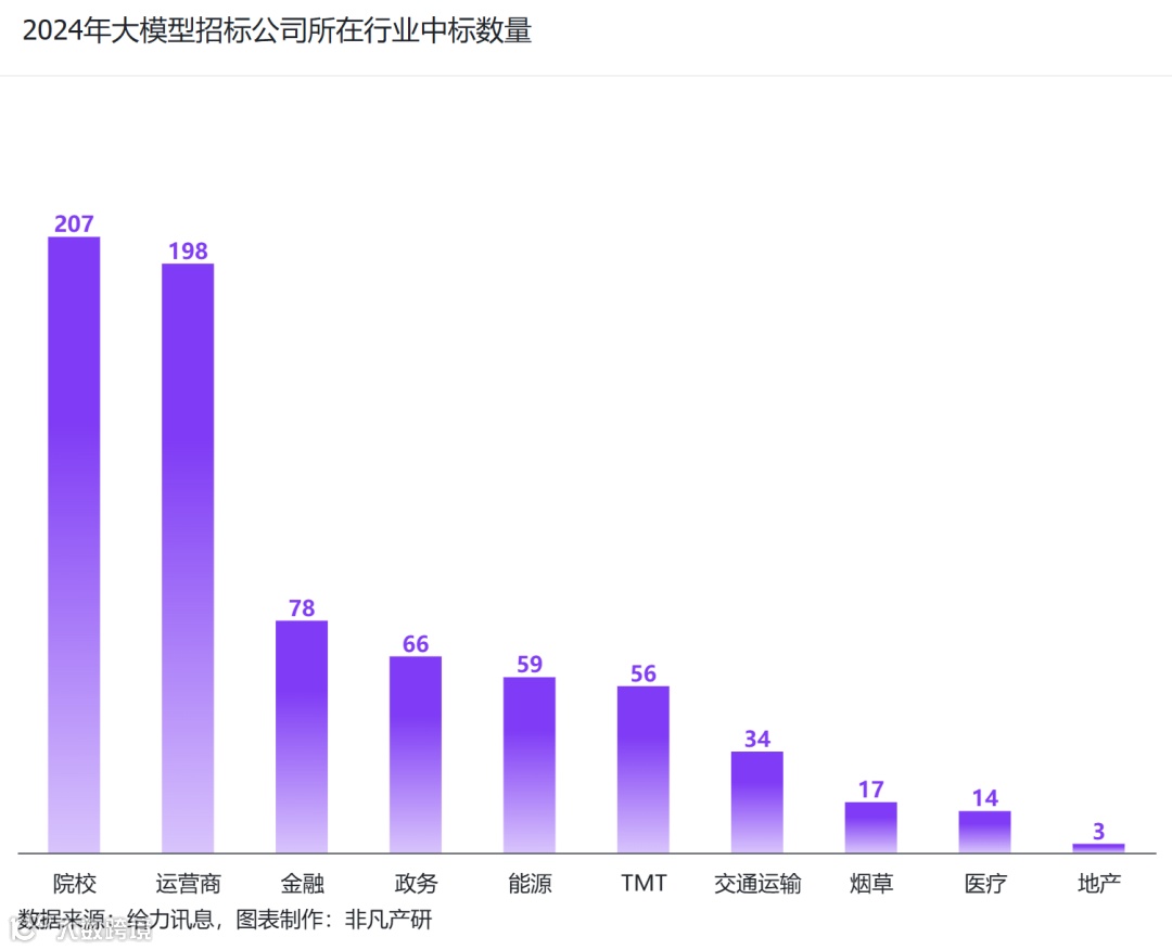 金融行业的中标数量为78个,位居第三。金融行业对AI大模型的需求日益显著,主要得益于金融行业数字化转型的推动。随着金融科技的快速发展,金融行业正经历着深刻的数字化转型。这一转型要求金融机构不断提升自身的数字化能力,以适应市场变化和客户需求。AI大模型作为数字化转型的重要工具,能够助力金融机构实现业务流程的自动化、智能化和高效化。