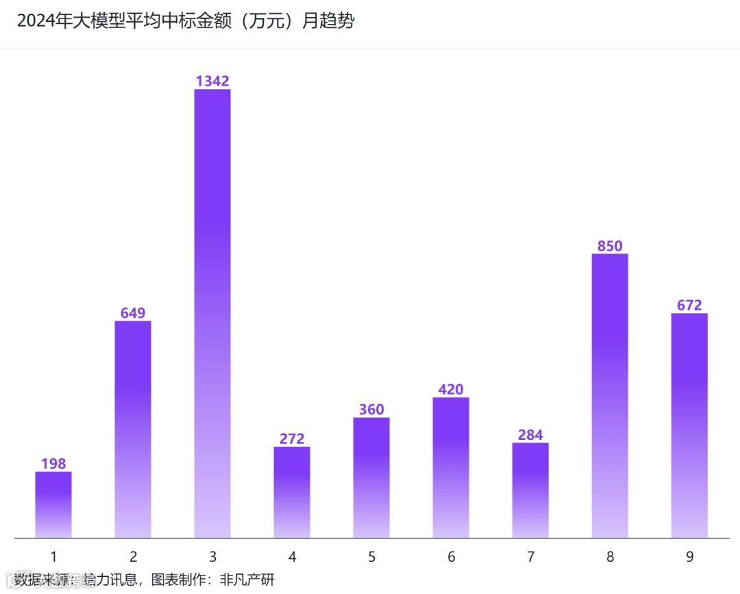 1-9月份大模型中标金额的月度平均值展现出显著的差异性。具体而言,最高中标金额高达1342万,而最低中标金额则仅为197万,两者之间存在着较大的差距。就整体而言,平均中标金额约为560.73万。