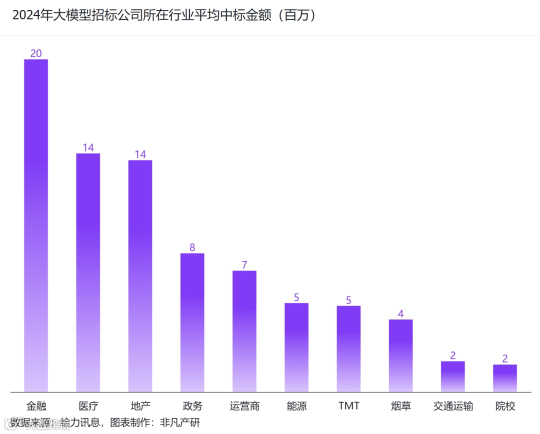 医疗行业和地产行业平均中标金额为1400万元,并列第二。医疗行业具有高度的专业性,不同科室和疾病类型需要不同的模型和算法。因此,大模型在医疗行业的应用往往需要根据具体需求进行定制开发,这也增加了项目的成本。另一方面,政策对医疗行业的数字化和智能化发展给予了大力支持。例如,鼓励医疗机构利用大数据、人工智能等技术进行医疗服务的创新和优化。这些政策引导了市场的发展方向,也促进了大模型在医疗行业的广泛应用。