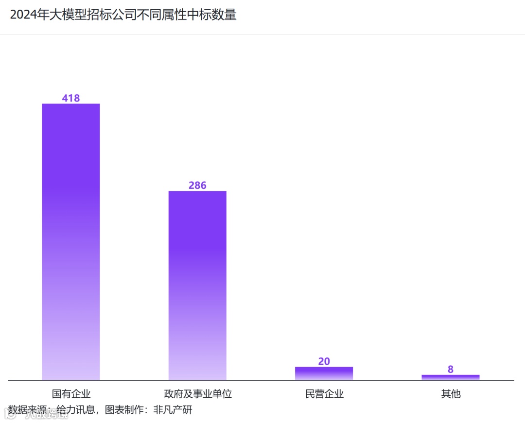 数据显示不同类型企业在招标中的表现差异较大。2024 年1-9月大模型招标中,国有企业和事业单位成为中坚力量,国有企业累计中标418个项目,占据了相当大的市场份额。政府及事业单位在大模型招标中共中标286次,显示出政府及事业单位在推动大模型技术应用方面的积极态度和实际行动。政府及事业单位的中标项目往往涉及公共服务、智慧城市等关键领域,对于提升社会治理水平、改善民生具有重要意义。