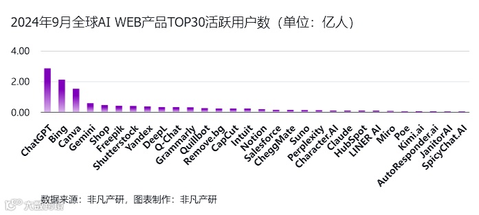 在2024年9月,全球AI WEB产品访问时长的Top30榜单中,ChatGPT以3.22亿小时的访问时长位居榜首,这一数字不仅显示了ChatGPT在AI领域的领先地位,也反映了用户对其的高度参与和依赖。Bing搜索引擎和Canva分别以2.03亿和1.00亿小时的访问时长位列第二、三名,显示出它们在提供信息检索和设计服务方面的强劲吸引力。