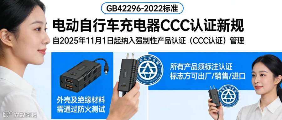 根据GB42296-2022标准,电动自行车用充电器自2025年11月1日起将纳入强制性产品认证(CCC认证)管理。所有相关产品必须通过CCC认证并标注认证标志,方可出厂、销售或进口。该标准要求充电器的外壳及绝缘材料必须通过防火测试,以确保在异常工况下具备足够的安全防护性能。截至目前,已有20余家企业的电动自行车充电器产品通过新国标体系审核。