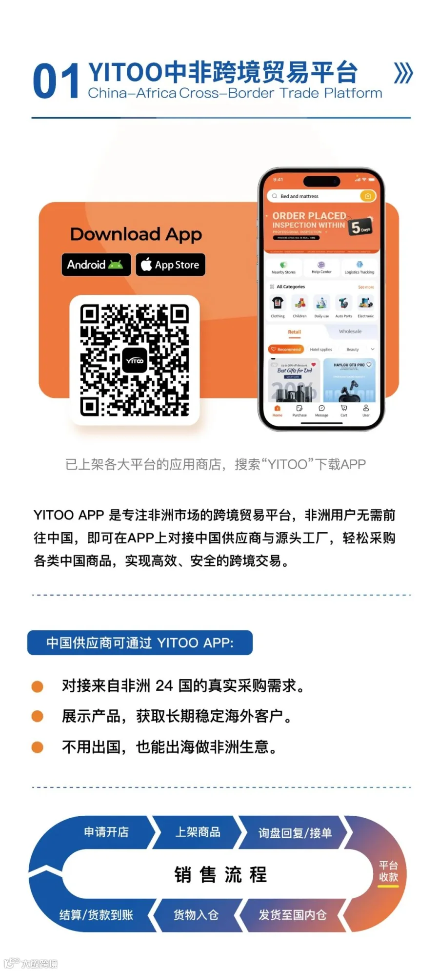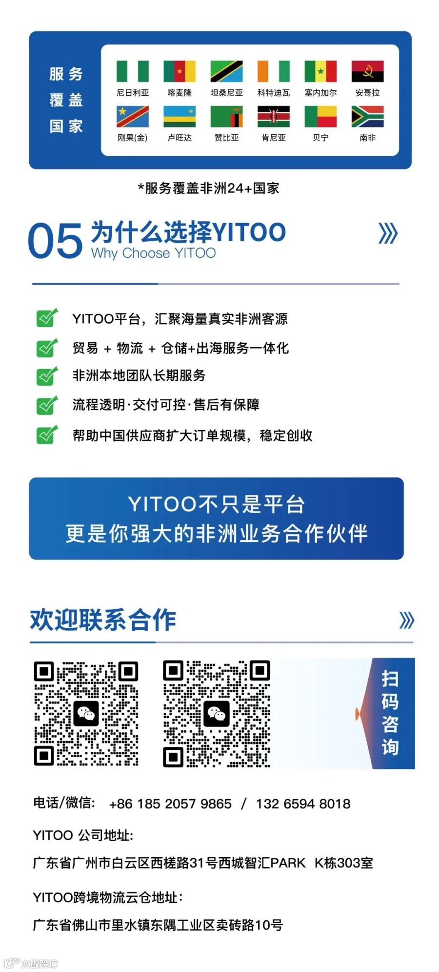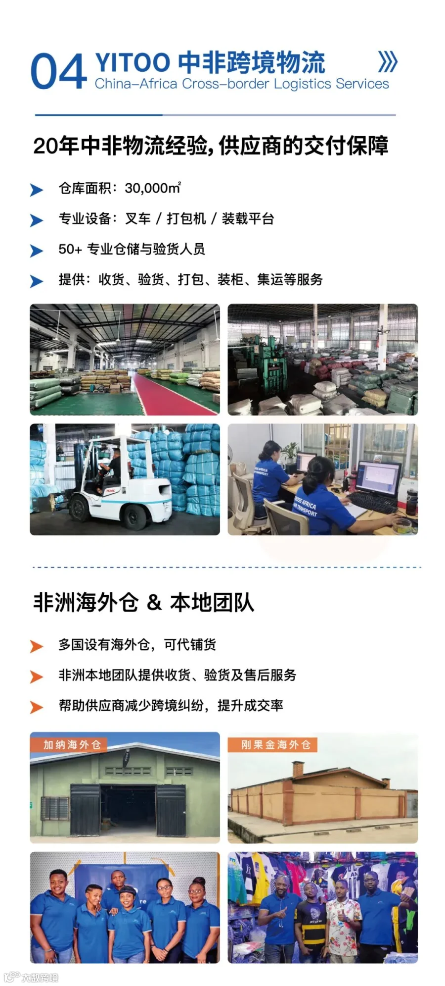 YITOO不是一个传统的电商平台,YITOO不仅在线上为中国商家与非洲商家之间提供更安全更规范的网上交易,更是在线下提供拼箱、整柜、仓储、以及海外仓清关服务。YITOO具备的综合服务能力和长期高效严谨的管理水平,完全值得非洲商家与中国商家的信任和支持。