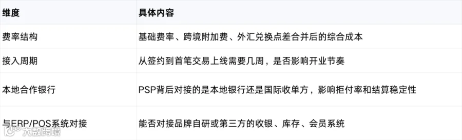 中国品牌出海选择PSP(支付服务商)时,通常重点考察以下四方面: