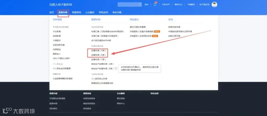 10、直接切换到自然人电子税务局,点击“我要办税-经营所得(A表)&经营所得(B表)”申报当期个税