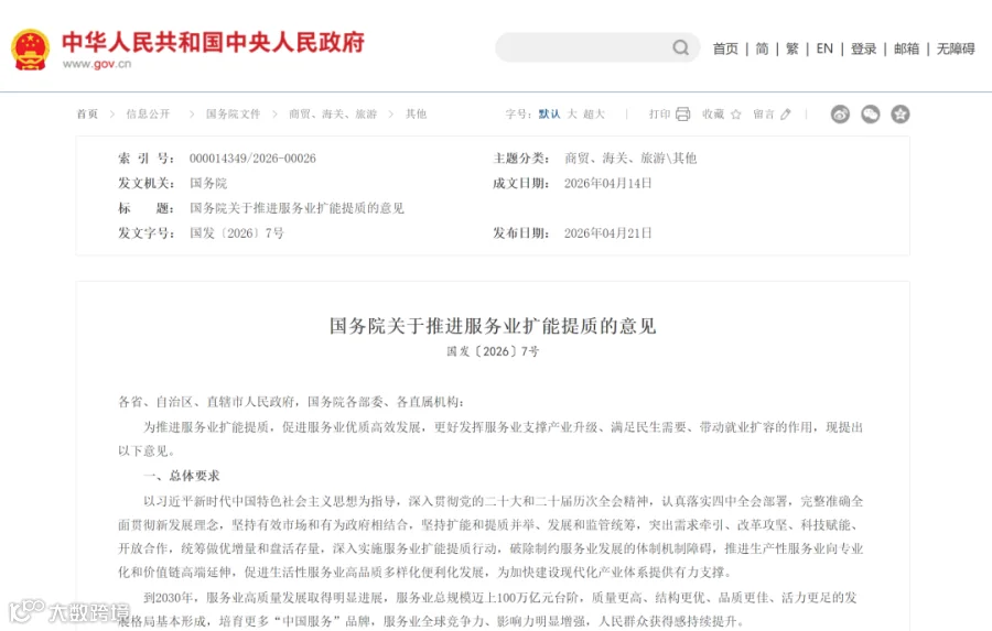 国务院印发《关于推进服务业扩能提质的意见》