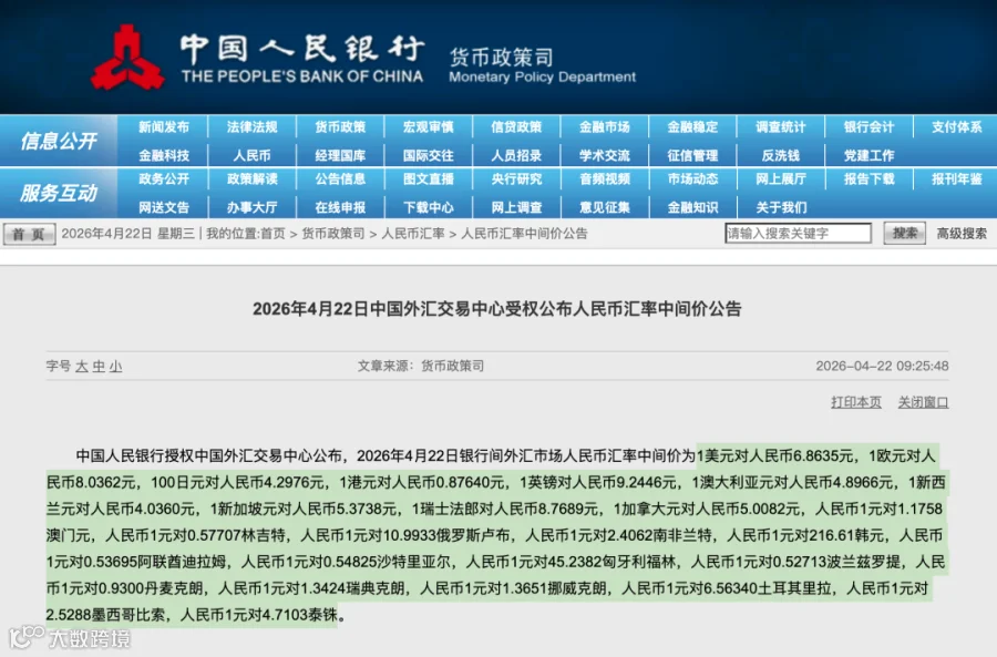 2026年4月22日银行间外汇市场人民币汇率中间价(来源:中国人民银行):