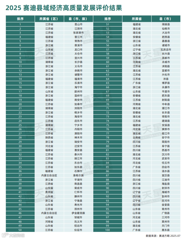 百强县评选基于经济实力、增长动力、内生支撑、区域能级和共享发展五大维度,GDP仅为指标之一。从分布看,江苏、浙江、山东领先,分别占25席、15席、12席;前十名中江苏占据六席,并包揽前三。