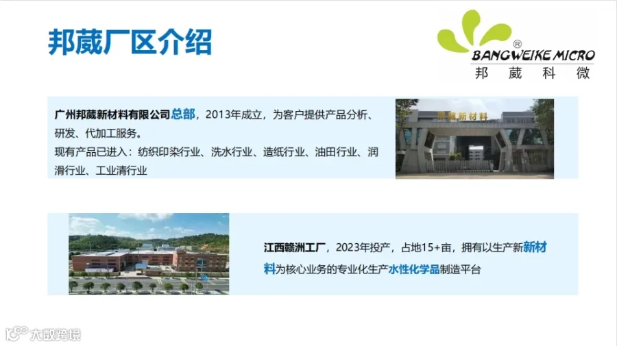 广州邦葳科微新材料有限公司是一家率先引进国外技术,结合国内需求生产企业,按照纺织助剂、造纸助剂客户要求,提供各种高附加值功能性产品。