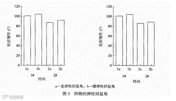 抗折皱性(涤棉混纺>纯棉):也可称为折痕恢复性,通常以折痕回复角表示。利用水平法折皱回复角测试仪,将织物按照经纬向分别加压一定时间后测量两翼之间形成的角度,以测得的角度来表示织物折痕回复能力。